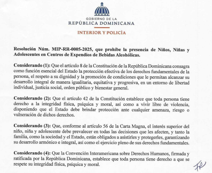 Con el objetivo de proteger a la niñez y la adolescencia, el Ministerio de Interior y Policía emitió la Resolución No. MIP-RR-0005-2025, mediante la cual prohíbe la presencia de niños, niñas y adolescentes en centros de expendio y consumo de alcohol en todo el territorio nacional.