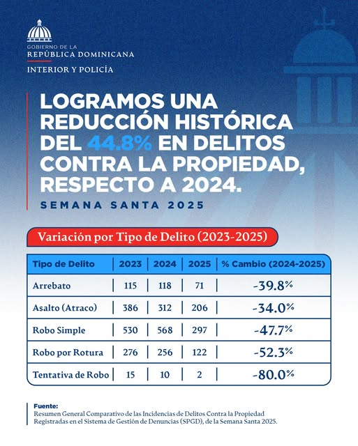 Santo Domingo.– La ministra de Interior y Policía, Faride Raful, destacó que la Semana Santa 2025 registró una significativa reducción en los delitos contra la propiedad, con una disminución histórica del 44.8 % en comparación con el mismo período del año anterior.